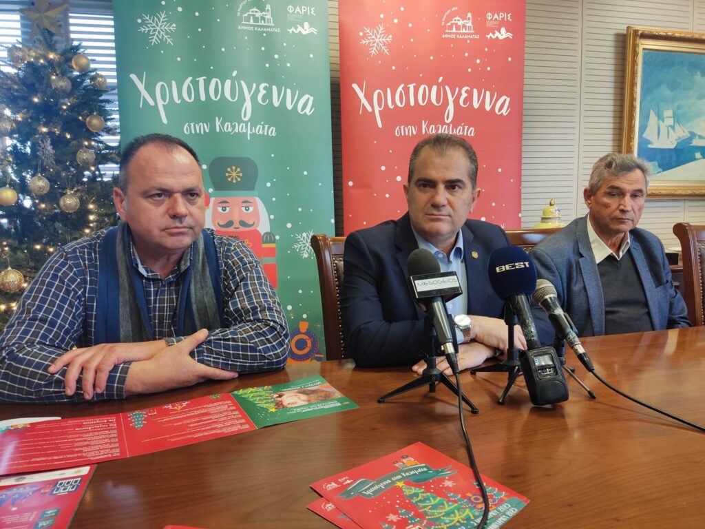 Ο Δήμαρχος Καλαμάτας, Θανάσης Βασιλόπουλος, πλαισιωμένος από τον Πρόεδρο της Κ.Ε. Φάρις Παντελή Δρούγα και τον Πρόεδρο της ΚΑΚ Τάσο Αγγελή, απηύθυνε κάλεσμα συμμετοχής -στο εορταστικό πρόγραμμα εκδηλώσεων- σε ντόπιους και επισκέπτες, ενημερώνοντας επίσης για τις δράσεις που ο Δήμος και οι φορείς του έχουν προγραμματίσει για την εορταστική περίοδο. Ιδιαίτερη αναφορά υπήρξε στη λειτουργία του Χριστουγεννιάτικου Σταθμού του Αϊ Βασίλη στο Δημοτικό Πάρκο Σιδηροδρόμων, στο παγοδρόμιο και τις λοιπές εορταστικές δράσεις που έχουν προγραμματιστεί.