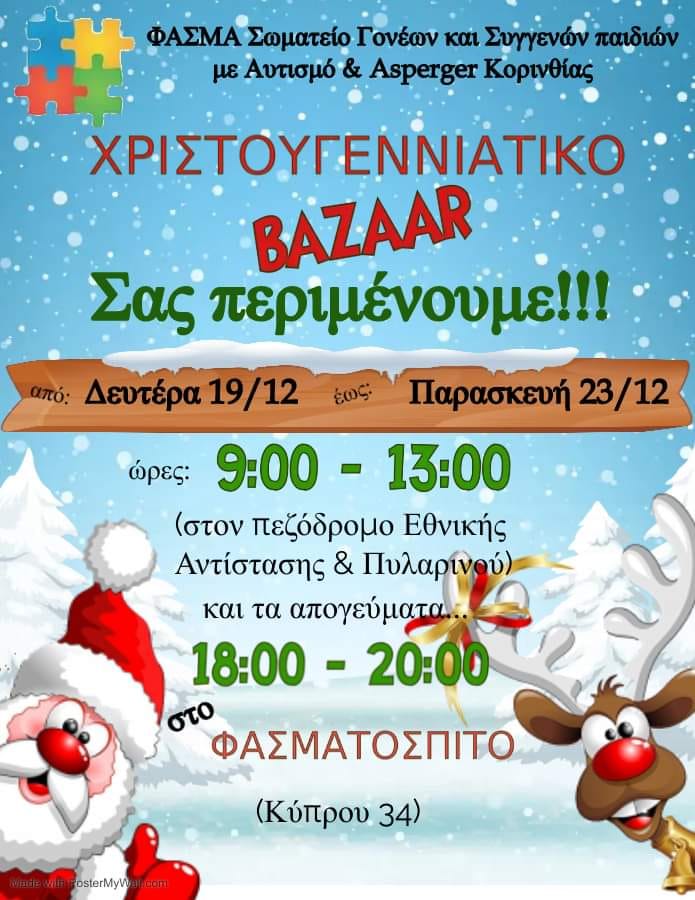 Και τα Απογεύματα από Δευτέρα πάλι 19 Δεκεμβρίου έως και Παρασκευή 23 Δεκεμβρίου, ώρες: 6:00 μ.μ έως 8:00 μ.μ σας περιμένουμε για τα ψώνια σας στο ΦΑΣΜΑΤΟΣΠΙΤΟ Κύπρου 34 στην Κόρινθο.