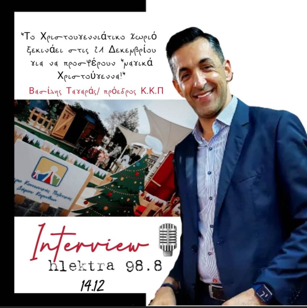 “Θέλουμε να προσφέρουμε χαρά! Οι εκδηλώσεις που έχουμε σχεδιάσει και υλοποιούμε αυτό ακριβώς θα κάνουν! Για 10 ολόκληρες ημέρες στην καρδιά της Κορίνθου, στην πλατεία Παναγή Τσαλδάρη, θα χτυπά η καρδιά των Χριστουγέννων! Το χριστουγεννιάτικο χωριό ξεκινά στις 21 Δεκεμβρίου και είστε προσκεκλημένοι όλοι» είπε το πρωί φιλοξενούμενος στο ραδιόφωνο του ΗΛΕΚΤΡΑ ο Πρόεδρος του Κ.ΚΠ. Βασίλης Ταγαράς.