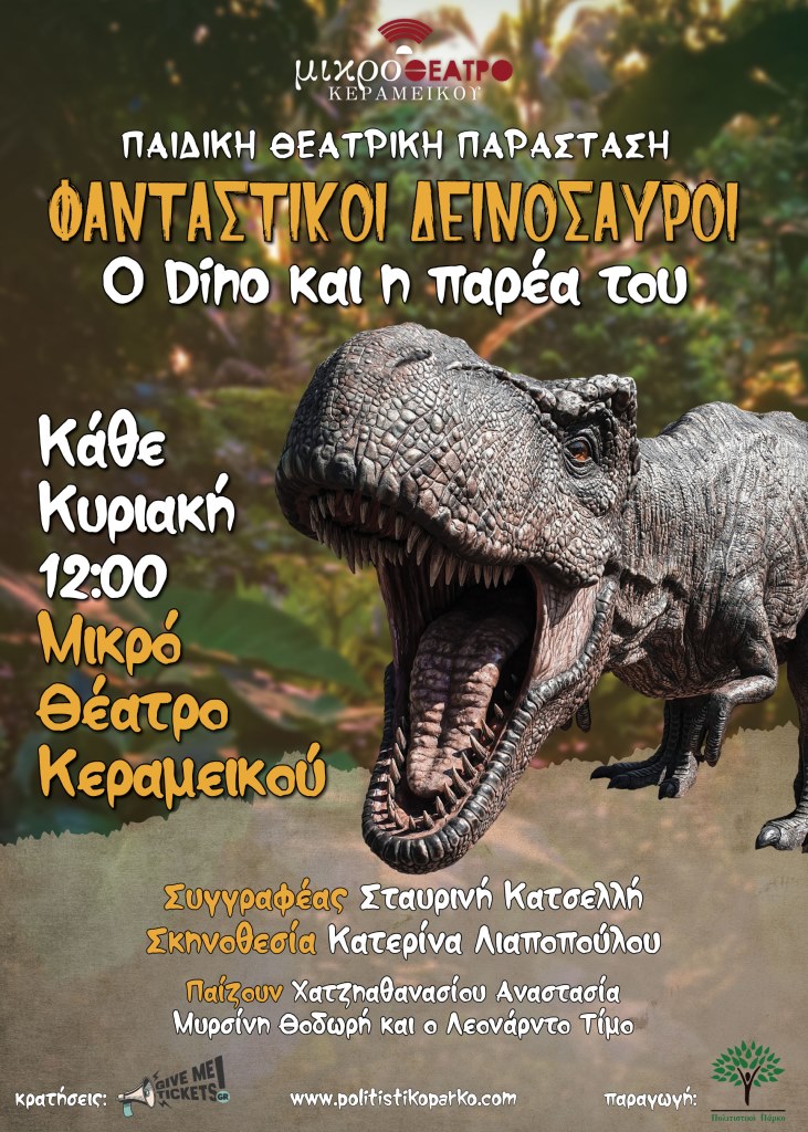 Το Πολιτιστικό Πάρκο παρουσιάζει την διαδραστική θεατρική παράσταση για παιδιά άνω των τεσσάρων ετών της Σταυρινής Κατσελλή. «ΦΑΝΤΑΣΤΙΚΟΙ ΔΕΙΝΟΣΑΥΡΟΙ – Ο Dino και η παρέα του»