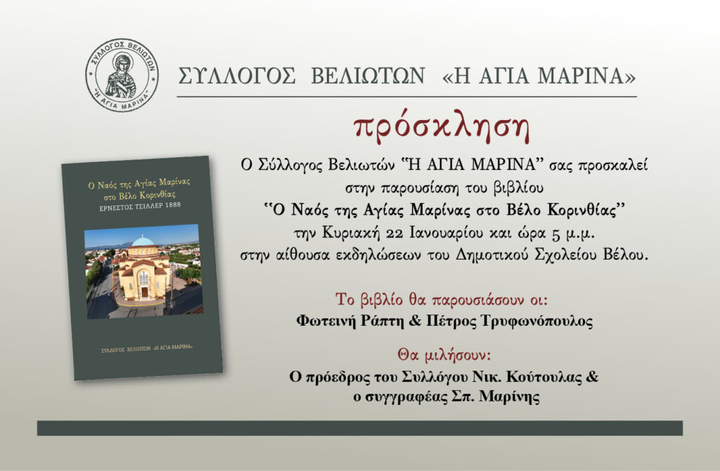 O Σύλλογος Βελιωτών “Η Αγία Μαρίνα” θα παρουσιάσει το βιβλίο “Ο Ναός της Αγίας Μαρίνας στο Βέλο Κορινθίας” την Κυριακή 22 Ιανουαρίου και ώρα 5.00 μ.μ. στην αίθουσα εκδηλώσεων του Δημοτικού Σχολείου Βέλου.