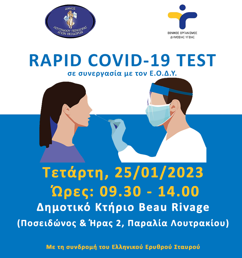 Ο Εθνικός Οργανισμός Δημόσιας Υγείας (ΕΟΔΥ) σε συνεργασία με τον Ελληνικό Ερυθρό Σταυρό και τον Δήμο Λουτρακίου – Περαχώρας – Αγίων Θεοδώρων θα διεξάγει δωρεάν ελέγχους ταχείας ανίχνευσης αντιγόνου (rapid test) Covid-19.