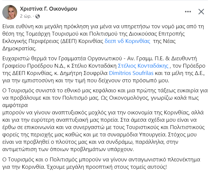 Αυτόν του Τομεάρχη Τουρισμού και Πολιτισμού της Διοικούσας Επιτροπής Εκλογικής Περιφέρειας (ΔΕΕΠ) Κορινθίας της Νέας Δημοκρατίας. Η πολυτάλαντη οικονομολόγος, δηλώνει πως η θέση αυτή είναι μεγάλη πρόκληση και ευθύνη και δηλώνει πρόθυμη να συνεργαστεί με τους Τουριστικούς και Πολιτιστικούς φορείς της περιοχής μας, καθώς και με τα συναρμόδια Υπουργεία, για να προβληθεί ο πλούτος της Κορινθίας και να συνδράμει παράλληλα, στην αντιμετώπιση των προβλημάτων. Αναμένουμε να δούμε τους καρπούς της δουλειάς της.