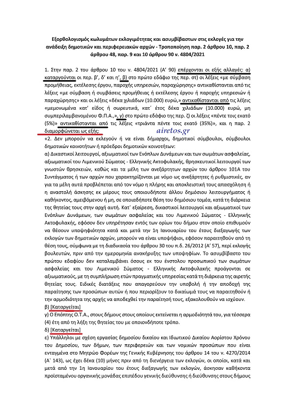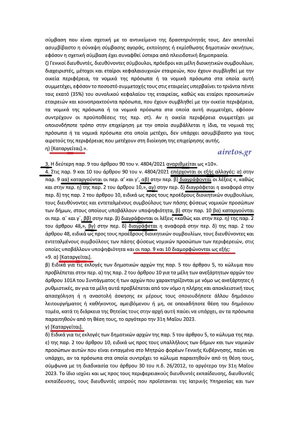 Με το Άρθρο 12, λοιπόν, τροποποιούνται ριζικά τα Άρθρα 10, 48 και 90 του ν.4804/2021 (είναι ο εκλογικός αυτοδιοικητικός Νόμος που ψήφισε η Ν.Δ. τον Ιούνιο του 2021).