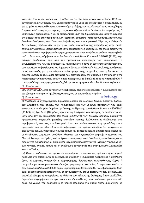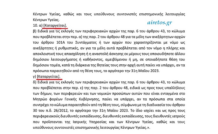 - Καταργείται το κώλυμα που είχαν οι Διοικητές, Υποδιοικητές, Πρόεδροι Διοικητικών Συμβουλίων, Διευθύνοντες ή Εντεταλμένοι Σύμβουλοι των ΝΠΔΔ, των κρατικών ΝΠΙΔ, των δημόσιων επιχειρήσεων και των επιχειρήσεων τη διοίκηση των οποίων ορίζει, άμεσα ή έμμεσα, το Δημόσιο με διοικητική πράξη ή ως μέτοχος, καθώς και των πάσης φύσεως Νομικών Προσώπων των Δήμων, οι οποίοι δεν είναι αιρετοί της Τοπικής Αυτοδιοίκησης, δεν έχουν εκλεγεί στα ανωτέρω αξιώματα, ή δεν έχουν οριστεί στις θέσεις αυτές λόγω ιδιότητας (ex officio).