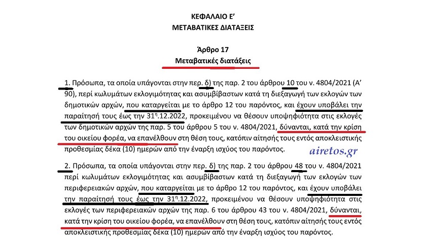 Υπογραμμίζουμε ότι στο Νομοσχέδιο περιλαμβάνεται και Άρθρο 17, το οποίο εισάγει δυνατότητα σε όσους ήδη παραιτήθηκαν λόγω καταργούμενου κωλύματος της περ.δ’ της παρ.2 του αρ.10 του ν.4804/2021, να επανέλθουν στη θέση τους μέσα σε 10 μέρες.