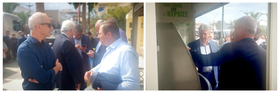 Χαίρομαι επίσης που είναι εδώ  και μικροί μαθητές διότι πιστεύουμε πολύ στην συμμετοχή των νέων στην ανταποδοτική ανακύκλωση. Τα 5 σημεία που σήμερα τοποθετούνται μας επιτρέπουν να ανακυκλώνουμε υλικά και να υπάρχει ανταπόδοση και σε είδος και σε χρήμα. Αυτό σημαίνει ότι περιορίζουμε τον όγκο των σκουπιδιών που ο δήμος πρέπει να διαχειριστεί και ταυτόχρονα  τα παιδιά μπορούν να πάνε εκδρομή δωρεάν γιατί θα έχουν χρήματα ενώ προστατεύουμε και το περιβάλλον.