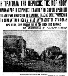 Σεισμός. Σχεδόν όλα τα κτίρια της Κορίνθου καταστράφηκαν. Το τελικό χτύπημα ήρθε στις 22:00 το βράδυ, όταν έγινε ο μεγάλος σεισμός των 6,3 Ρίχτερ. Οι δονήσεις που συνεχίστηκαν και για τις επόμενες δύο μέρες, δεν άφησαν τίποτα όρθιο.