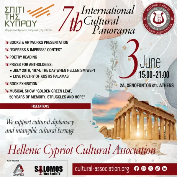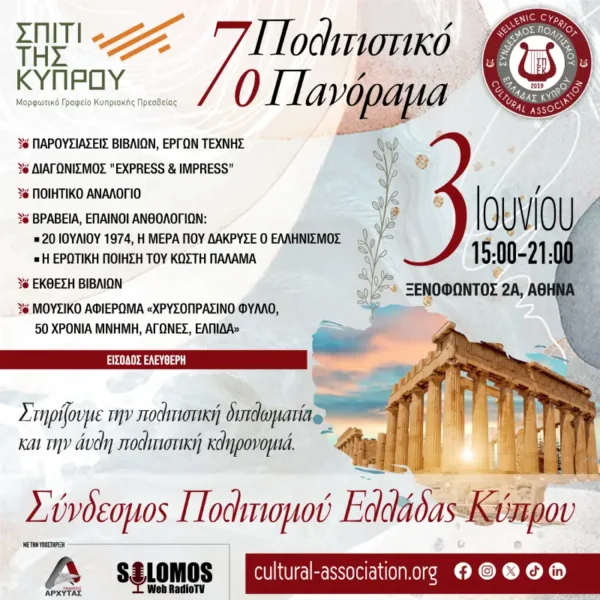 - Είσαι λογοτέχνης, ποιητής, συγγραφέας, ζωγράφος, καλλιτέχνης, μουσικός με επάρκεια στην Ελληνική και Αγγλική γλώσσα; Επιθυμείς να μιλήσεις για τη ζωή και την ιστορία σου; Θέλεις να παρουσιάσεις το έργο σου εντός και εκτός Ελλάδας; Τότε, δήλωσε συμμετοχή στο “7ο Πολιτιστικό Πανόραμα” του Συνδέσμου Πολιτισμού Ελλάδας Κύπρου στην Αθήνα, που πραγματοποιείται τη Δευτέρα 3 Ιουνίου 2024, 15:00-21:00, στο Σπίτι της Κύπρου, Μορφωτικό Γραφείο της Κυπριακής Πρεσβείας – Ξενοφώντος 2Α Αθήνα.