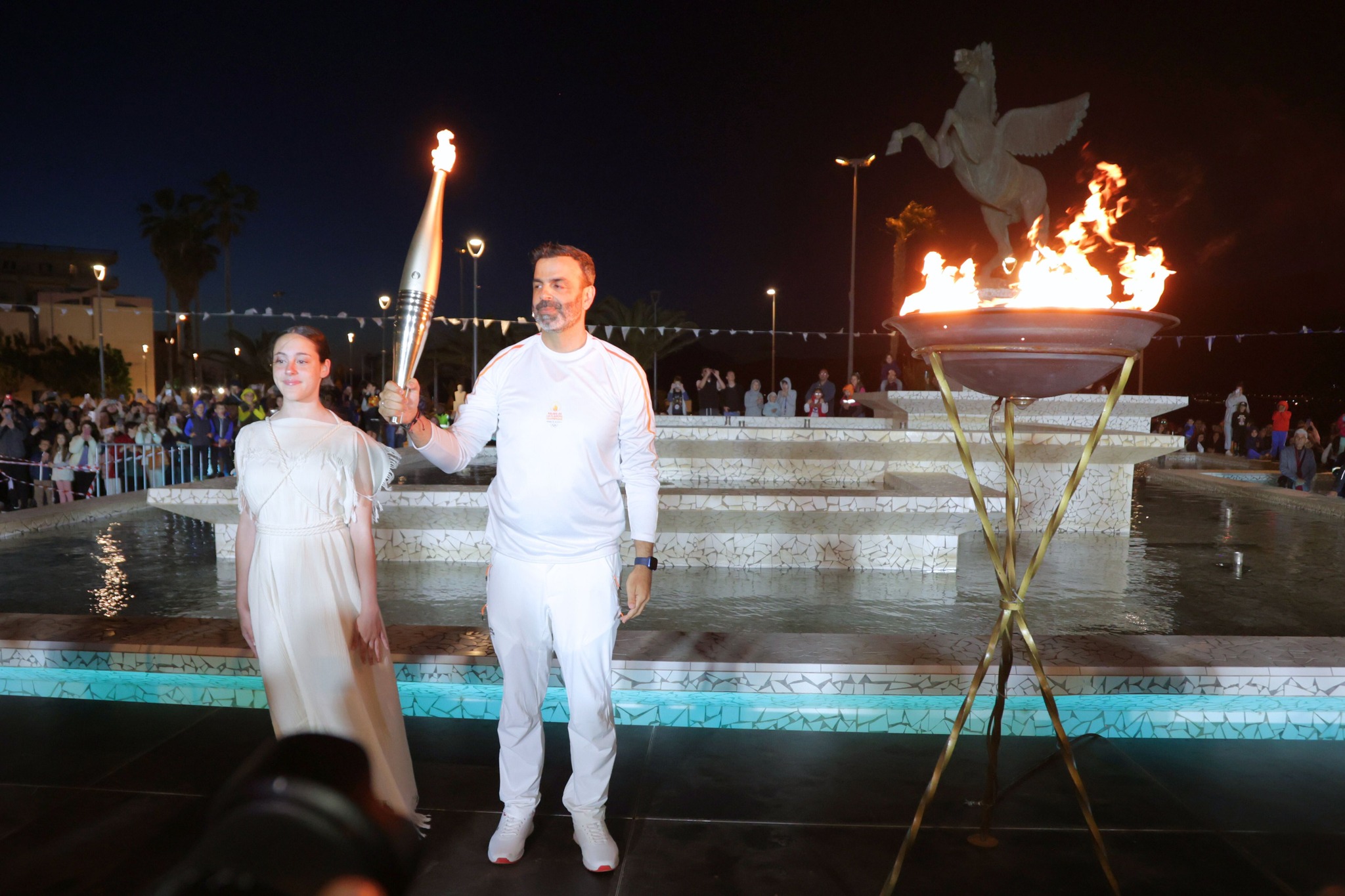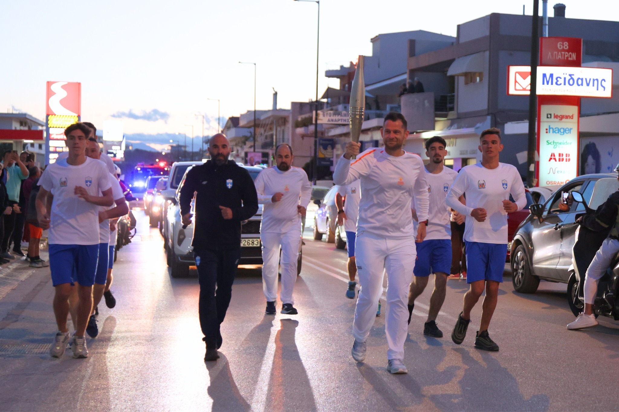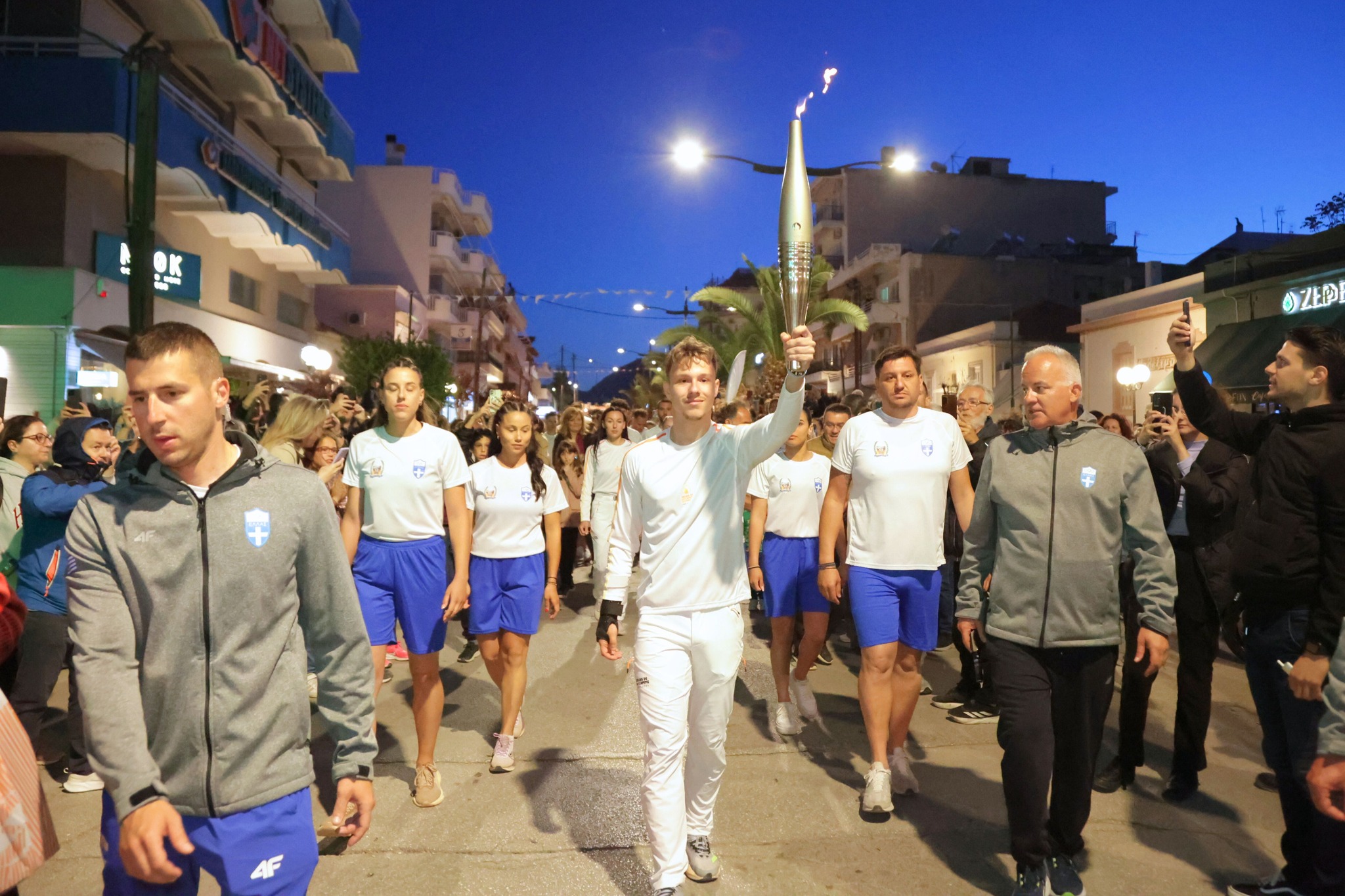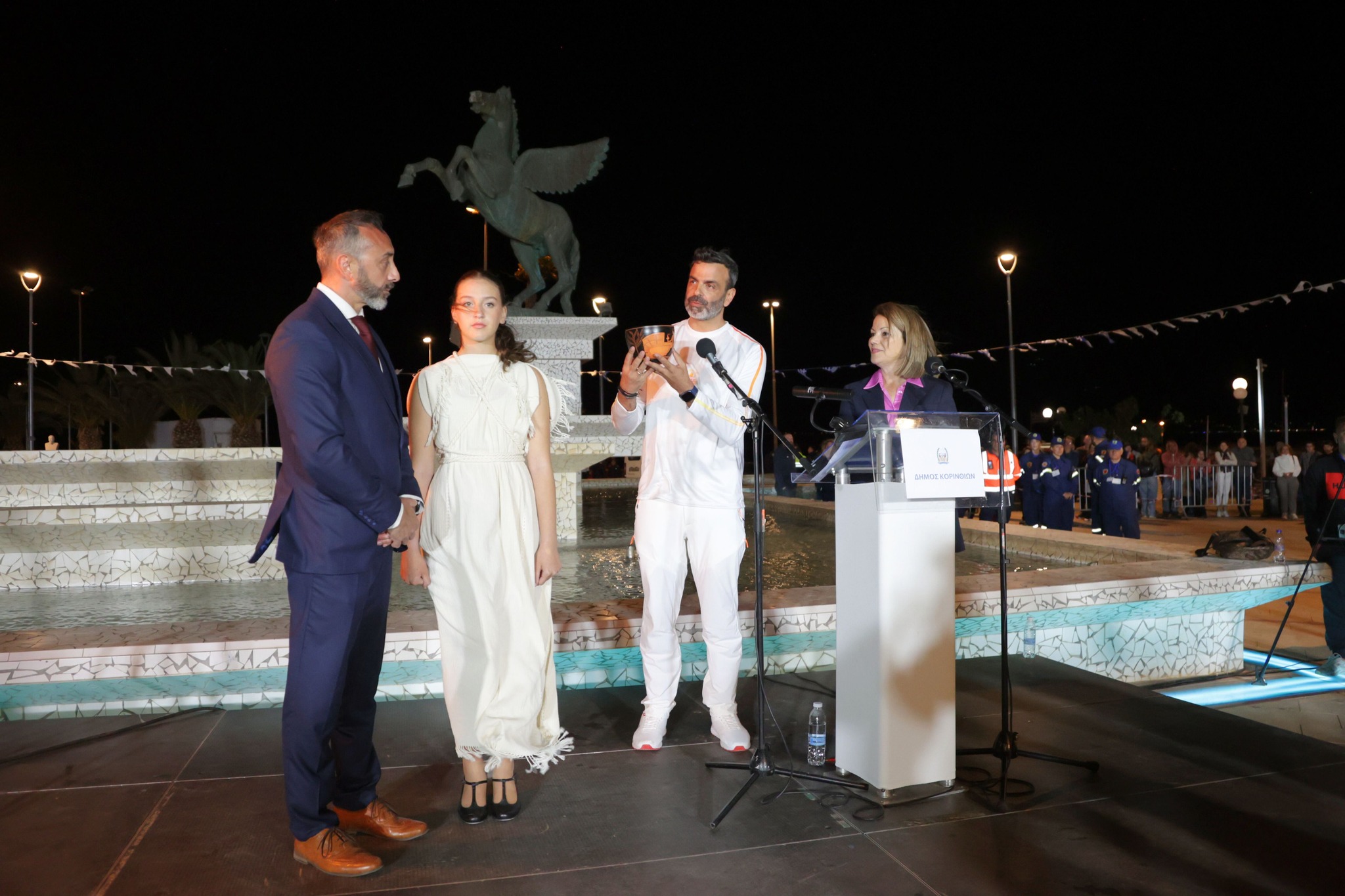 Μέσα από τους κεντρικούς δρόμους της πόλης, η φλόγα έφτασε στην πλατεία Ελευθερίου Βενιζέλου όπου τον βωμό άναψε ο Κορίνθιος Ολυμπιονίκης & μέλος της Ε.Ο.Ε. Νίκος Ξυλούρης.