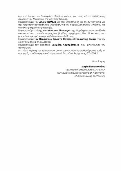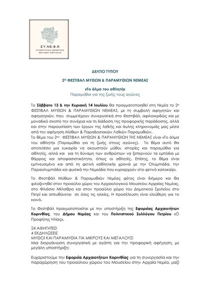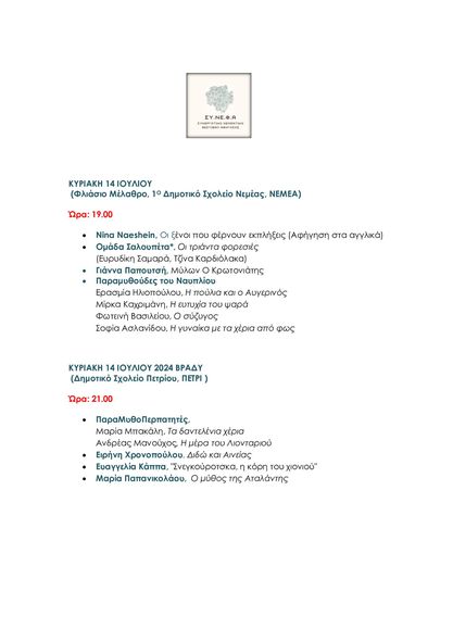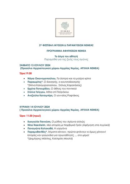 - Αγαπητοί φίλοι των παραμυθιών, μικροί και μεγάλοι, σας περιμένουμε όλους στο 2ο ΦΕΣΤΙΒΑΛ ΜΥΘΩΝ & ΠΑΡΑΜΥΘΙΩΝ ΝΕΜΕΑΣ που θα πραγματοποιηθεί το διήμερο 13 & 14 Ιουλίου 2024 στον προαύλιο χώρο του Αρχαιολογικού Μουσείου Αρχαίας Νεμέας, στο Φλιάσιο Μέλαθρο και στον προαύλιο χώρο του Δημοτικού Σχολείου στο Πετρί.