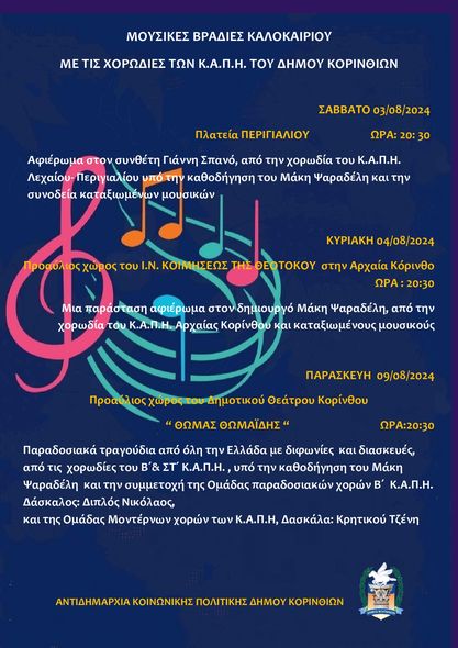 3. Τέλος, την επόμενη Παρασκευή, 9 Αυγούστου, και πάλι στις 8.30 το βράδυ, έξω από το Δημοτικό Θέατρο της Κορίνθου, οι χορωδίες των Β και Στ ΚΑΠΗ του δήμου μας, όπως πάντα υπό την καθοδήγηση του Μάκη Ψαραδέλη, θα παρουσιάσουν παραδοσιακά τραγούδια από όλη την Ελλάδα, με διφωνίες και διασκευές. Μαζί τους θα είναι η ομάδα παραδοσιακών χορών του Β΄ ΚΑΠΗ, με δάσκαλο τον Νίκο Διπλό.