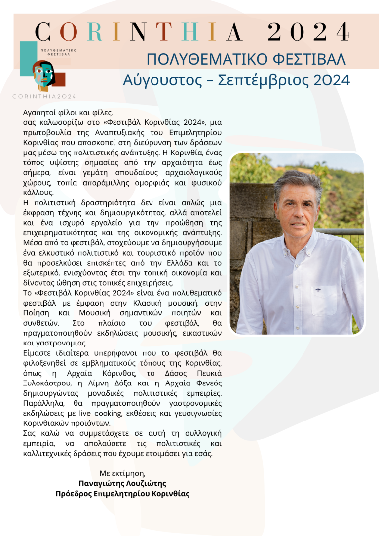 Ευελπιστούμε το Φεστιβάλ Κορινθία 2024 να αποτελέσει έναν θεσμό που θα αναδεικνύει τον πολιτισμό, την τέχνη και τη γαστρονομία της περιοχής μας για πολλά χρόνια.