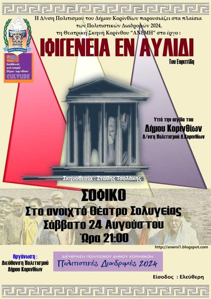 Σάββατο, 24 Αυγούστου στο Σοφικό – Θεατρική παράσταση «ΙΦΙΓΕΝΕΙΑ ΕΝ ΑΥΛΙΔΙ» από τη Θεατρική Σκηνή Κορίνθου ΑΝΕΜΗ.