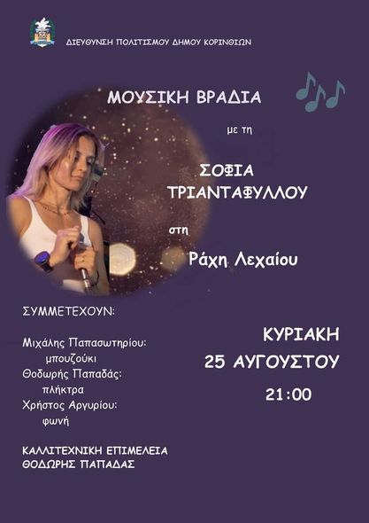Κυριακή, 25 Αυγούστου στο Λέχαιο – Μουσική βραδιά με το σχήμα της Σοφίας Τριανταφύλλου.
