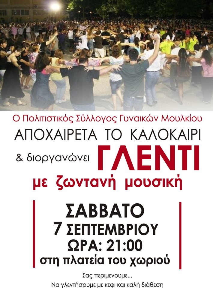 ShareTweet 0 Όλοι οι δρόμοι το ΣΑΒΒΑΤΟ 7 Σεπτεμβρίου οδηγούν στο Μούλκι! Ελάτε να γλεντήσουμε με την ορχήστρα μας! Θα χορέψουμε όλοι μαζί μία παρέα. Σας περιμένουμε…