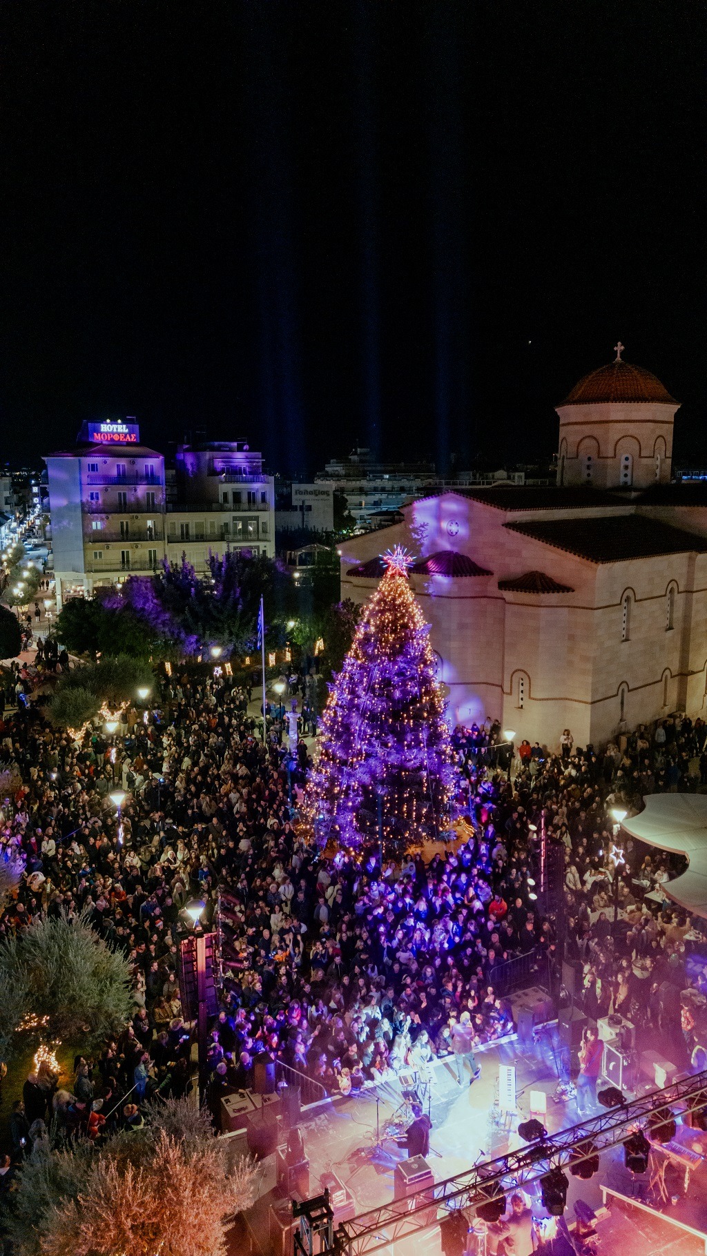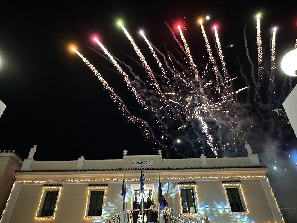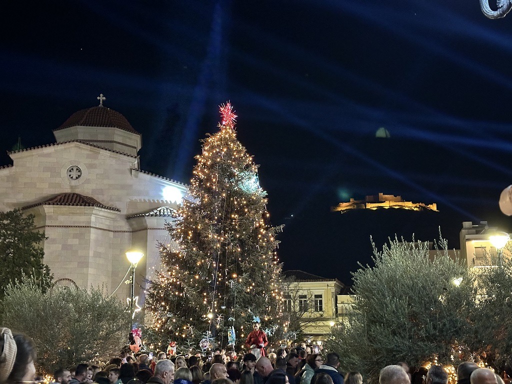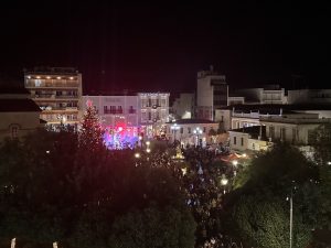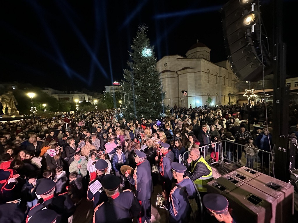 Η ατμόσφαιρα γιορτινή, με τον ουρανό να φωτίζεται από τα λαμπιόνια του εντυπωσιακού δέντρου και τα πυροτεχνήματα , ενώ μουσικές, παιδικές φωνές και χαμόγελα πλημμύρισαν τον χώρο.