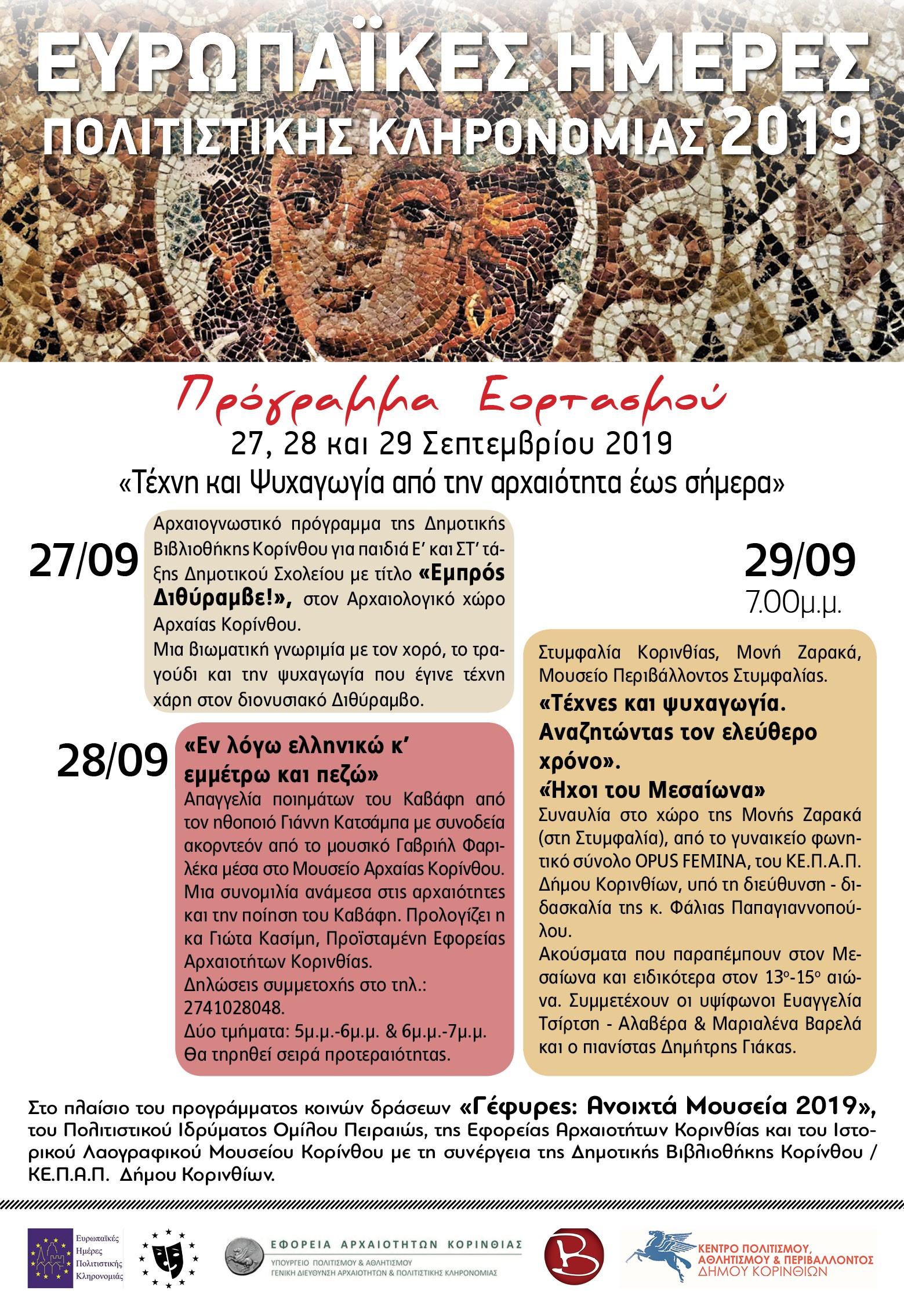 Οι Ευρωπαϊκές Ημέρες Πολιτιστικής Κληρονομιάς 2019, πραγματοποιούνται σε όλη την Ευρώπη από τον Αύγουστο έως τον Οκτώβριο. Το φετινό σύνθημα είναι «Τέχνες και Ψυχαγωγία». Με πάνω από 70.000 προγραμματισμένες εκδηλώσεις, οι Ευρωπαϊκές Ημέρες Πολιτιστικής Κληρονομιάς είναι το μεγαλύτερο πολιτιστικό γεγονός με συμμετοχή πολιτών στην Ευρώπη. Στόχο έχει να αναδείξει την αξία της κοινής μας κληρονομιάς, υπογραμμίζοντας την ανάγκη διατήρησής της, τόσο για τη σημερινή γενιά όσο και για τις μελλοντικές. Η πολιτιστική κληρονομιά έχει θεμελιώδη σημασία για τις κοινωνίες και για τη σύνδεση του παρελθόντος με το μέλλον και πρέπει να βρίσκεται στο επίκεντρο της καθημερινής ζωής των πολιτών.