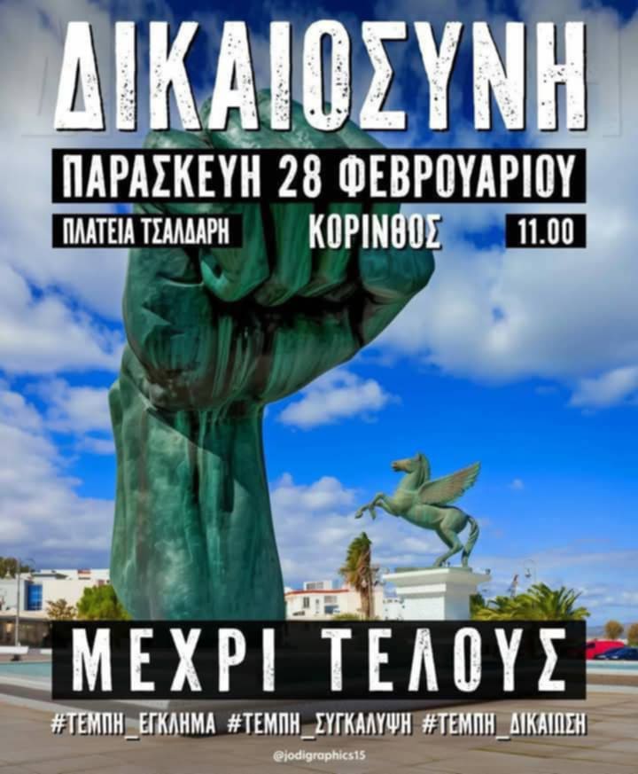 Την Παρασκευή 28 Φεβρουαρίου μαζευόμαστε στην Κόρινθο, στην Πλατεία Τσαλδάρη στις 11:00 το πρωί ως ένδειξη διαμαρτυρίας για ένα σύστημα διαφθοράς που σκοτώνει και φυσικά για συμπαράσταση στις 57 οικογένειες που δεν θα ηρεμήσουν εάν δεν δικαιωθούν και δεν θα δουν οτέ τους ανθρώπους τους!