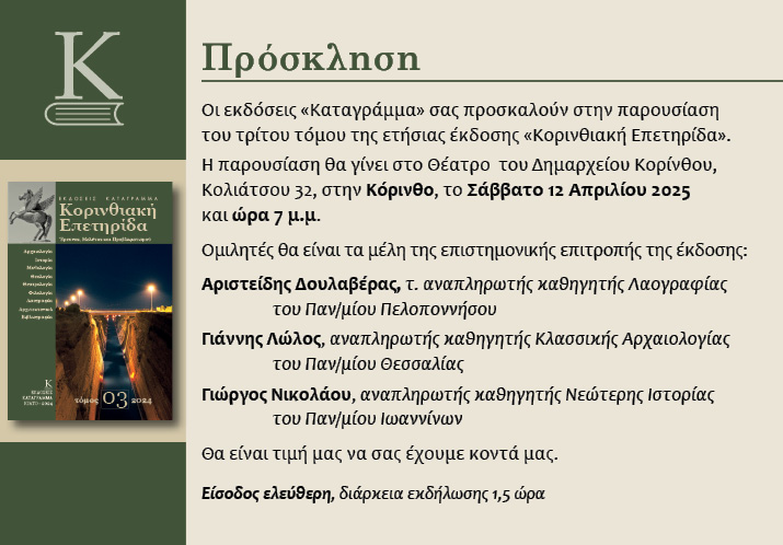 - Με πλούσια ύλη κυκλοφόρησε ο 3ος τόμος (2024) του επιστημονικού περιοδικού «ΚΟΡΙΝΘΙΑΚΗ ΕΠΕΤΗΡΙΔΑ Έρευνας, Μελέτης και Προβληματισμού», από τις Εκδόσεις μας.