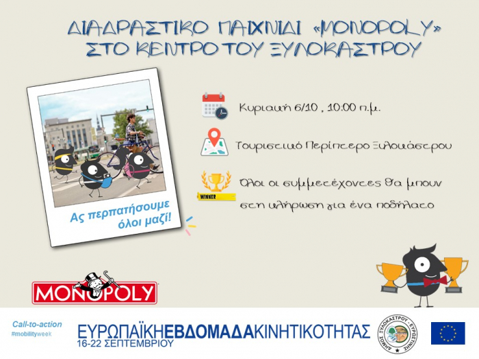 Ο Δήμος Ξυλοκάστρου- Ευρωστίνης συνεχίζοντας τις δράσεις για την ΕΕΚ 2019 καλεί μικρούς & μεγάλους την Κυριακή 6/10 στις 10:30 να συμμετάσχουν σε ένα διαδραστικό παιχνίδι «Μονόπολης» στο κέντρο του Ξυλοκάστρου. Σημείο εκκίνησης έχει οριστεί το Δάσος στο σημείο που βρίσκεται πίσω από το Τουριστικό Περίπτερο Ξυλοκάστρου και τερματισμός θα είναι το Πάρκο Κυκλοφοριακής Αγωγής.