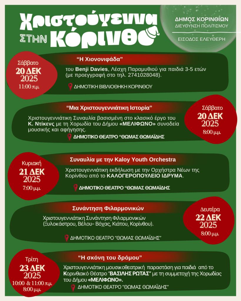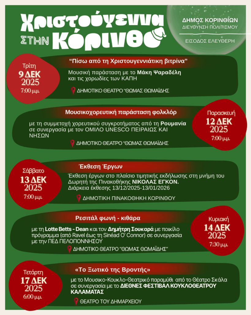 Έφτασε η στιγμή, με μεγάλη χαρά να παρουσιάσουμε το πλούσιο πρόγραμμα εκδηλώσεων που ετοίμασε η Διεύθυνση Πολιτισμού του Δήμου Κορινθίων: