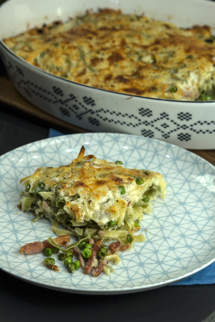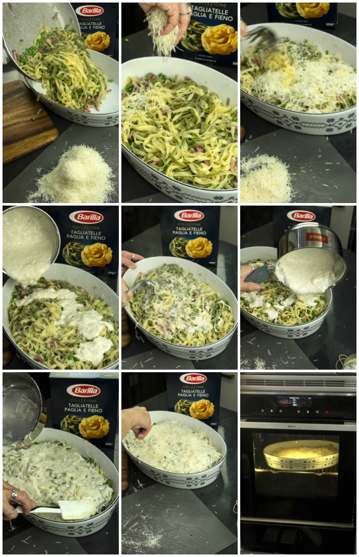 Σε μεγάλη κατσαρόλα βάζετε τουλάχιστον 4-5 λίτρα νερό να βράσουν. Παράλληλα βάζετε τον φούρνο να προθερμανθεί στους 180ºC πάνω-κάτω. Όταν βράσει το νερό, ρίχνετε 1-2 κ.σ. χοντρό αλάτι και αφού κοχλάσει ρίχνετε μέσα τις ταλιατέλες. Ανακατεύετε κάθε τόσο. θα τις αφήσετε από 1’ ως 1:30” λιγότερο χρόνο απ’ όσο λέει η συσκευασία, δηλαδή μόνο 4:30’-5’ μιας και θα μαγειρευτούν επιπλέον και στον φούρνο, απορροφώντας υγρασία. Τα ρίχνετε στο τηγάνι με τον αρακά και το μπείκον και τ’ ανακατεύετε ελαφρά.
