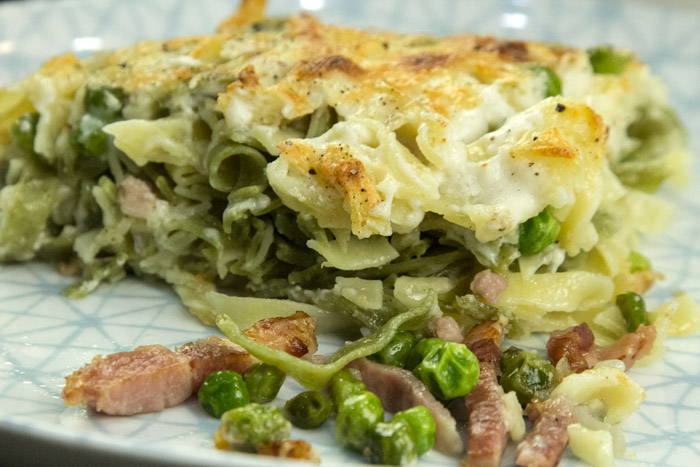 Eύκολη συνταγή με τρεις απλές παρασκευές που συνδυάζονται στο ταψί που μπαίνει στο φούρνο. Θα την ολοκληρώσετε μέσα σε 1 ώρα. Μπορείτε πάντα να κάνετε την εκτέλεση “χωρίς φούρνο”, οπότε δεν χρειάζεται να κάνετε μπεσαμέλ. Αντ’ αυτής θα προσθέσετε στο μίγμα κρεμμύδι, μπείκον αρακά μετά το 1ο στάδιο, 200γρ. κρέμα γάλακτος. Στη συνέχεια βράστε τα Πάλια ε Φιένο “στο σωστό χρόνο τους”, και βάλτε τα στο τηγάνι, ανακατέψτε, ρίξτε τυρί από πάνω και έχετε την εναλλακτική εκδοχή της συνταγής άνευ φούρνου. Γενικά μπορείτε να παίξετε με διαφορετικά αλλαντικά από μπέικον ως προσιούτο κλπ. και εναλλακτικά τυριά με έντονο χαρακτήρα, όπως σημειώσαμε αναλυτικά πιο πάνω.