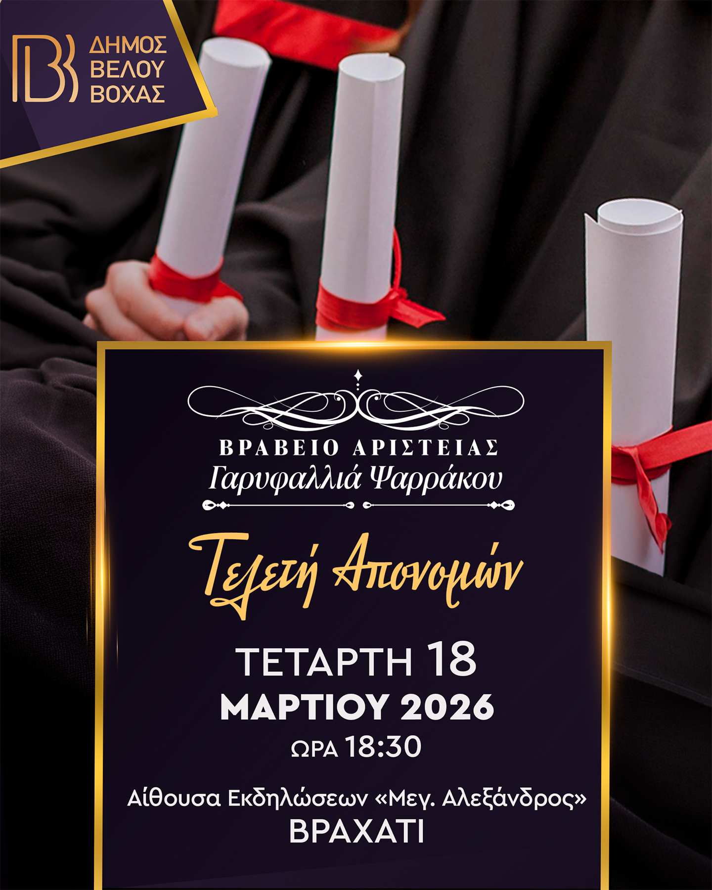 Στην αίθουσα εκδηλώσεων «Μέγας Αλέξανδρος» στο Βραχάτι, η τοπική μας κοινωνία θα συναντηθεί για να τιμήσει τους αριστούχους της νεολαίας μας, αλλά και να αναμετρηθεί με τις δύσκολες προκλήσεις της σύγχρονης πραγματικότητας.