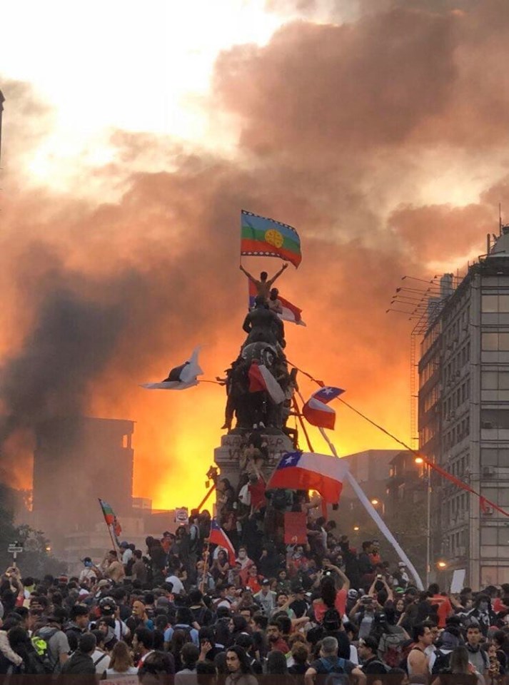 Στη Χιλή 1,5 εκατομμύριο πολίτες έχουν βγει στους δρόμους. Η χώρα είναι εδώ και χρόνια το όνειρο του Πινοσέτ (’80), με ιδιωτικοποιημένα τα πάντα, από τις πρώην δημόσιες υπηρεσίες και την ασφάλιση μέχρι το νερό. Οι κάτοικοι των πόλεων πίνουν αφαλατωμένο νερό γιατί τα φυσικά αποθέματα είναι αγορασμένα από εταιρίες και χρησιμοποιούνται σε ορυχεία χρυσού. Τα διεθνή ΜΜΕ λένε ότι οι διαδηλώσεις γίνονται ενάντια στην “κοινωνική αδικία”, ενώ στην πραγματικότητα είναι το φυσικό αποτέλεσμα του ανεξέλεγκτου νεοφιλελευθερισμού και του ιδιωτικού κέρδους πάνω από όλα. Αυτό που συμβαίνει εδώ και μερικές μέρες στη Χιλή δεν είναι άλλη μια “χρωματιστή επανάσταση” με κατσαρόλες. Είναι κανονική, αυθόρμητη, μαζική και πάνω από όλα πολιτική. Η παρακάτω φώτο, ίσως η καλύτερη της χρονιάς, είναι από το Σαντιάγκο (Susana Hidalgo). Μια πυραμίδα ανθρώπων με σημαίες και στην κορυφή αυτή των Mapuche, ομάδας φυλών ιθαγενών της Παταγονίας, οι οποίοι μοιράζονται κοινές αξίες συλλογικότητας και κοινή ιστορία πολέμων απέναντι στους Ισπανούς κατακτητές.