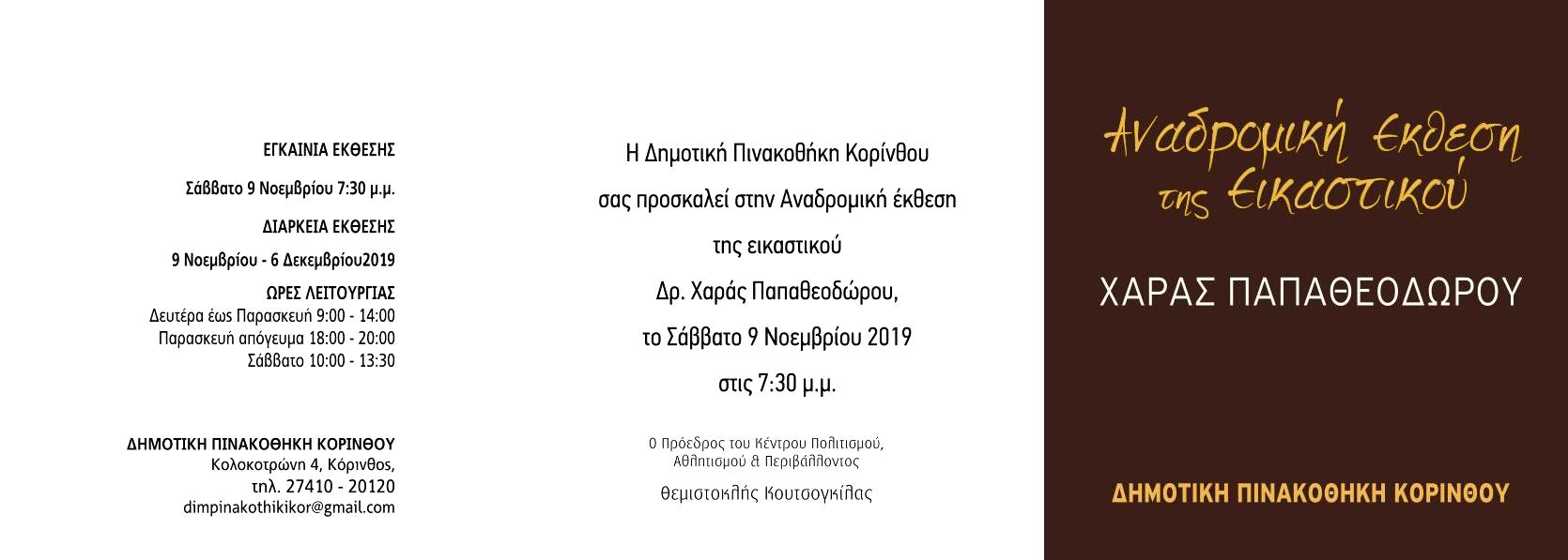 Η Δημοτική Πινακοθήκη Κορίνθου σας προσκαλεί στην Αναδρομική Έκθεση της εικαστικού Δρ. Χαράς Παπαθεοδώρου, το Σάββατο 9 Νοεμβρίου 2019 στις 7.30 μ.μ