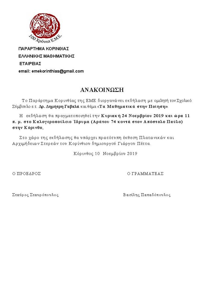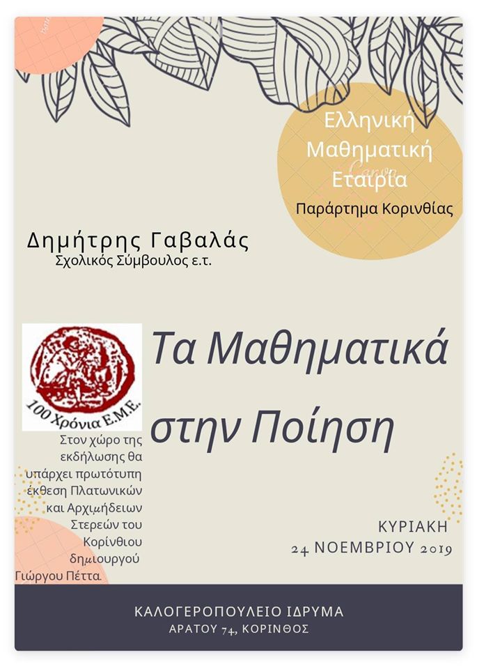 ShareTweet 0 Την Κυριακή 24 Νοεμβρίου, το παράρτημα Κορινθίας της Ελληνικής Μαθηματικής Εταιρίας διοργανώνει εκδήλωση με θέμα «τα Μαθηματικά στην Ποίηση» στο Καλογεροπούλειο Ίδρυμα στις 11:00πμ