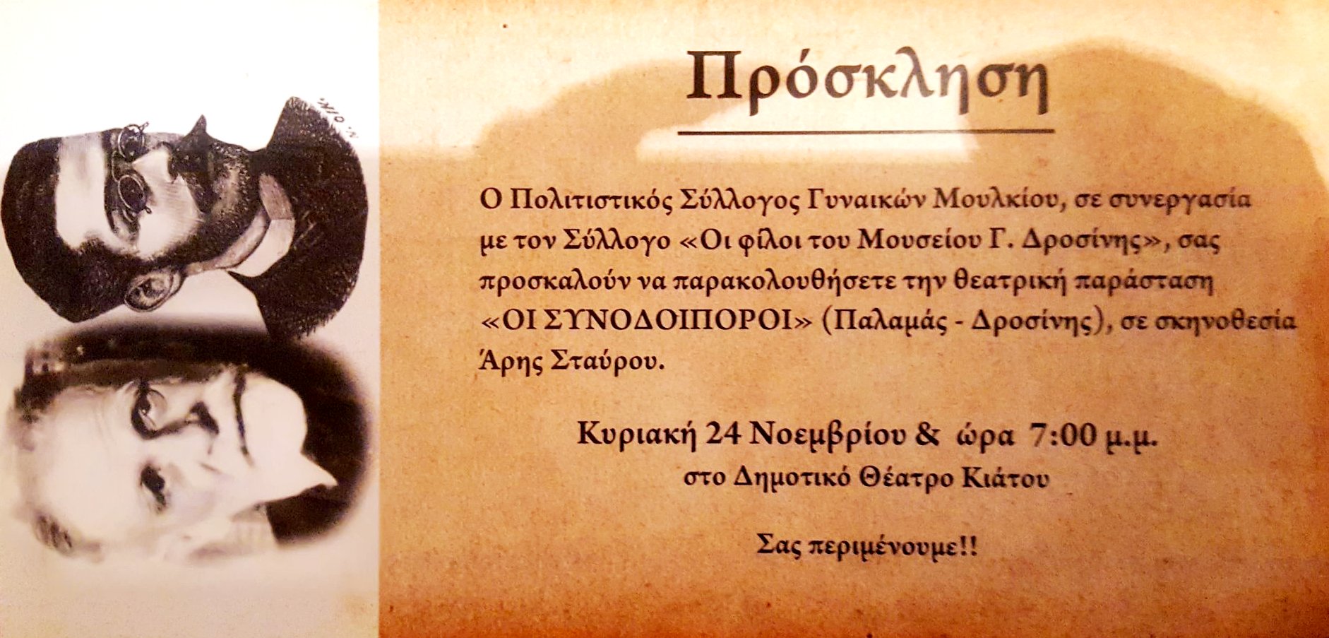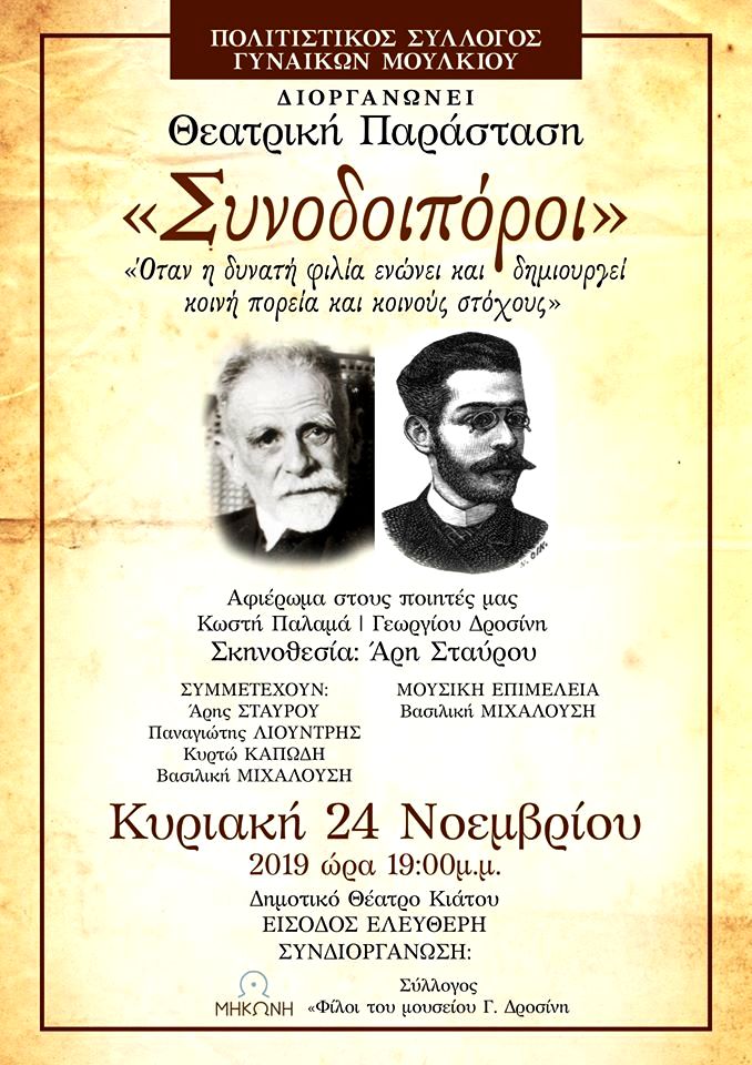 ΔΙΑΝΥΟΝΤΑΣ ΤΟ ΕΤΟΣ *ΠΑΛΑΜΑ* Ο ΣΥΛΛΟΓΟΣ ΜΑΣ ΣΕ ΣΥΝΕΡΓΑΣΙΑ ΜΕ ΤΟΝ ΣΥΛΛΟΓΟ *ΟΙ ΦΙΛΟΙ ΤΟΥ ΜΟΥΣΕΙΟΥ ΔΡΟΣΙΝΗ* ΔΙΟΡΓΑΝΩΝΟΥΝ ΘΕΑΤΡΙΚΗ ΠΑΡΑΣΤΑΣΗ ΑΦΙΕΡΩΜΕΝΗ ΣΤΟΥΣ *ΣΥΝΟΔΟΙΠΟΡΟΥΣ* ΠΑΛΑΜΑ-ΔΡΟΣΙΝΗ ΔΥΟ ΜΕΓΑΛΟΙ ΠΟΙΗΤΕΣ ΠΟΥ ΤΟΥΣ ΕΝΩΝΕΙ ΜΙΑ ΔΥΝΑΤΗ ΦΙΛΙΑ .