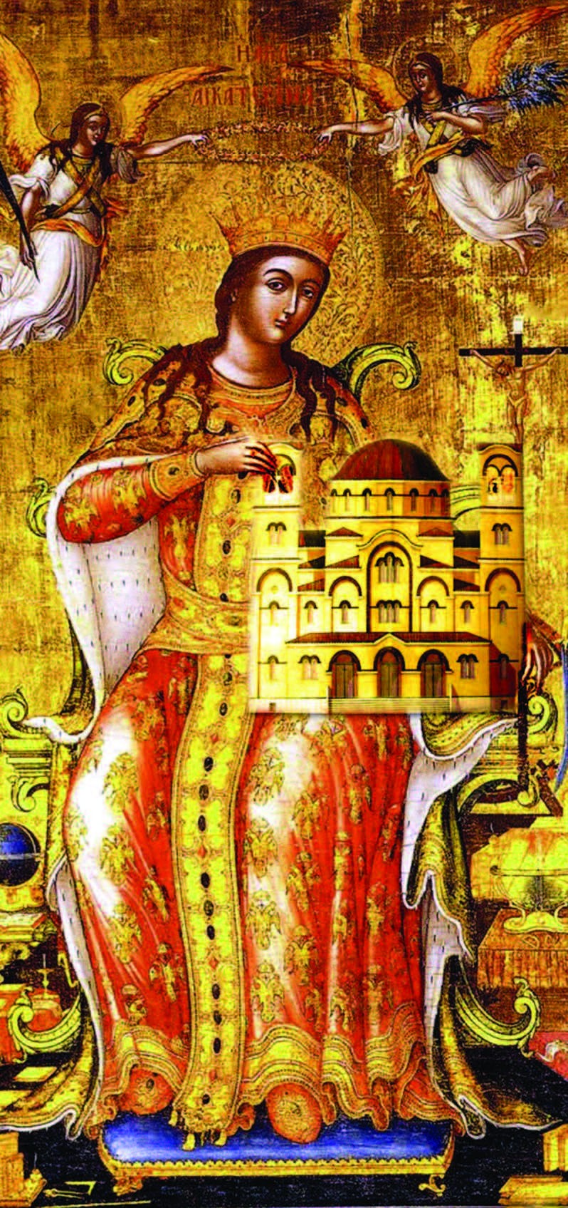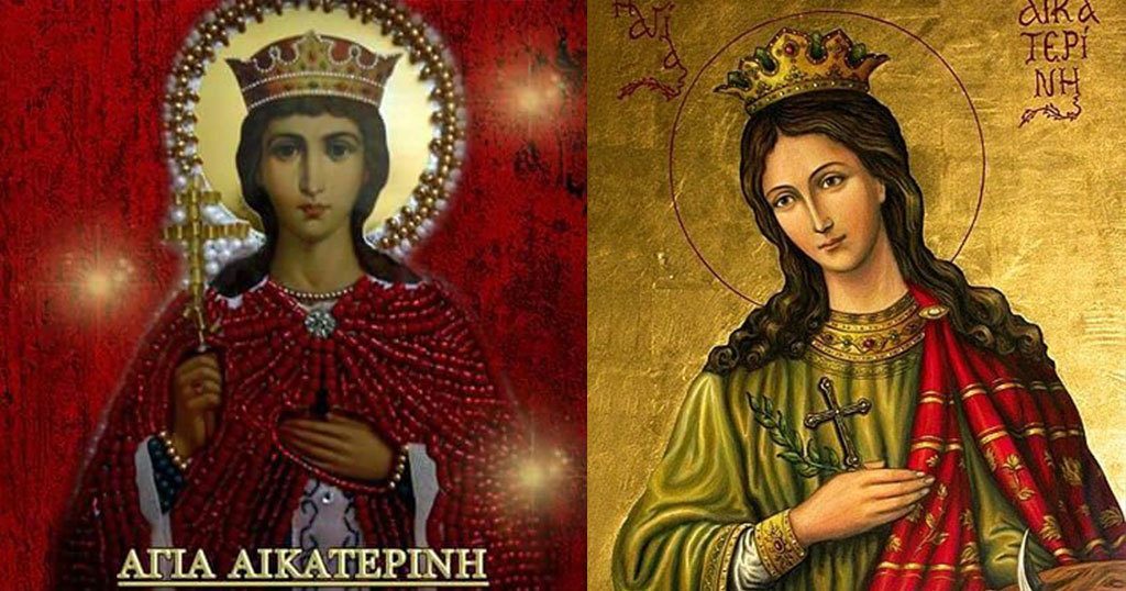 Αγία Αικατερίνη: Η Αγία Αικατερίνη καταγόταν από οικογένεια ευγενών της Αλεξάνδρειας, «θυγάτηρ βασιλίσκου τινός ονομαζομένου Kώνστου», και μαρτύρησε στις αρχές του 4ου αιώνα μ.Χ. (304 μ.Χ.)