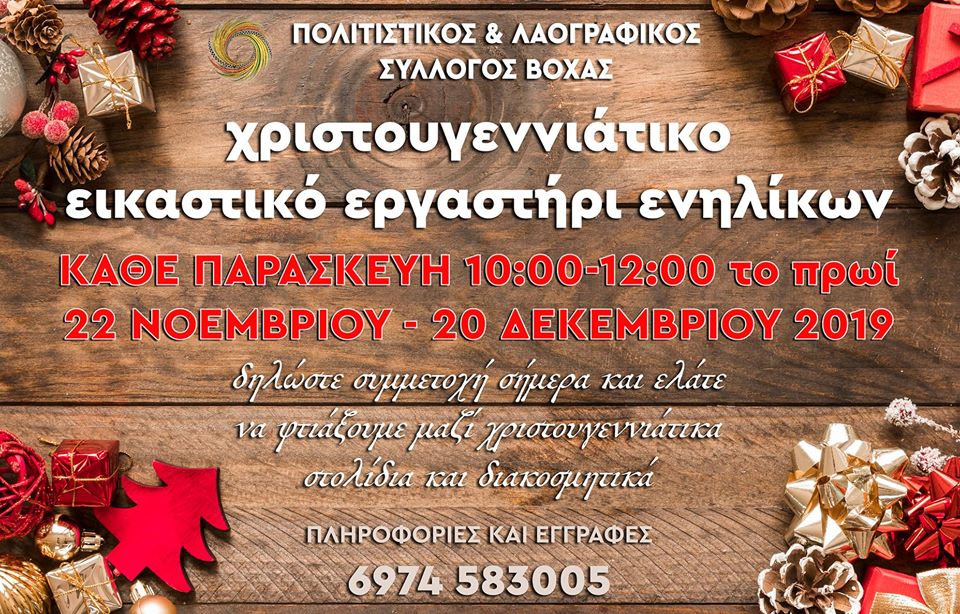 ShareTweet 0 ΧΡΙΣΤΟΥΓΕΝΝΙΑΤΙΚΟ εικαστικό εργαστήρι ενηλίκων από τον Πολιτιστικό & Λαογραφικό Σύλλογο Βόχας, κάθε Παρασκευή, από 22 Νοεμβρίου έως 20 Δεκεμβρίου.