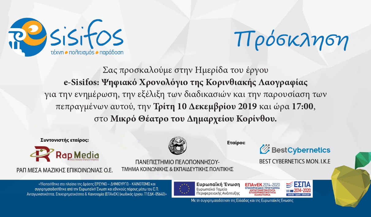 Η ομάδα του e-Sisifos εργάστηκε αδιάκοπα και άοκνα όλο αυτό το διάστημα προβαίνοντας σε: βιβλιογραφική έρευνα στον τομέα της Λαογραφίας, καταγραφή εθίμων, επαφή με ανθρώπους του πνεύματος, της προσφοράς και της συμμετοχής, κατασκευή διαδικτυακής πύλης, κατασκευή εφαρμογής για κινητά, πανεπιστημιακή έρευνα στη μεθοδολογία των τεχνικών καταγραφής αρχειακού υλικού, βελτιωτικές προτάσεις επί προτάσεων, εκπαίδευση χρηστών στην Κορινθία, συμμετοχή στο μεγαλύτερο εμπορικό γεγονός της Πελοποννήσου. Και ακολουθεί ένας ακόμα χρόνος, όπου το e-Sisifos θα φροντίσει να πετύχει τον μεγαλύτερό του στόχο: να αποτελέσει μια παρακαταθήκη πολιτισμού και παράδοσης της Κορινθίας για τα παιδιά μας, αλλά και να ριζωθεί μέσα μας ως αναπόσπαστο κομμάτι της ταυτότητάς μας.