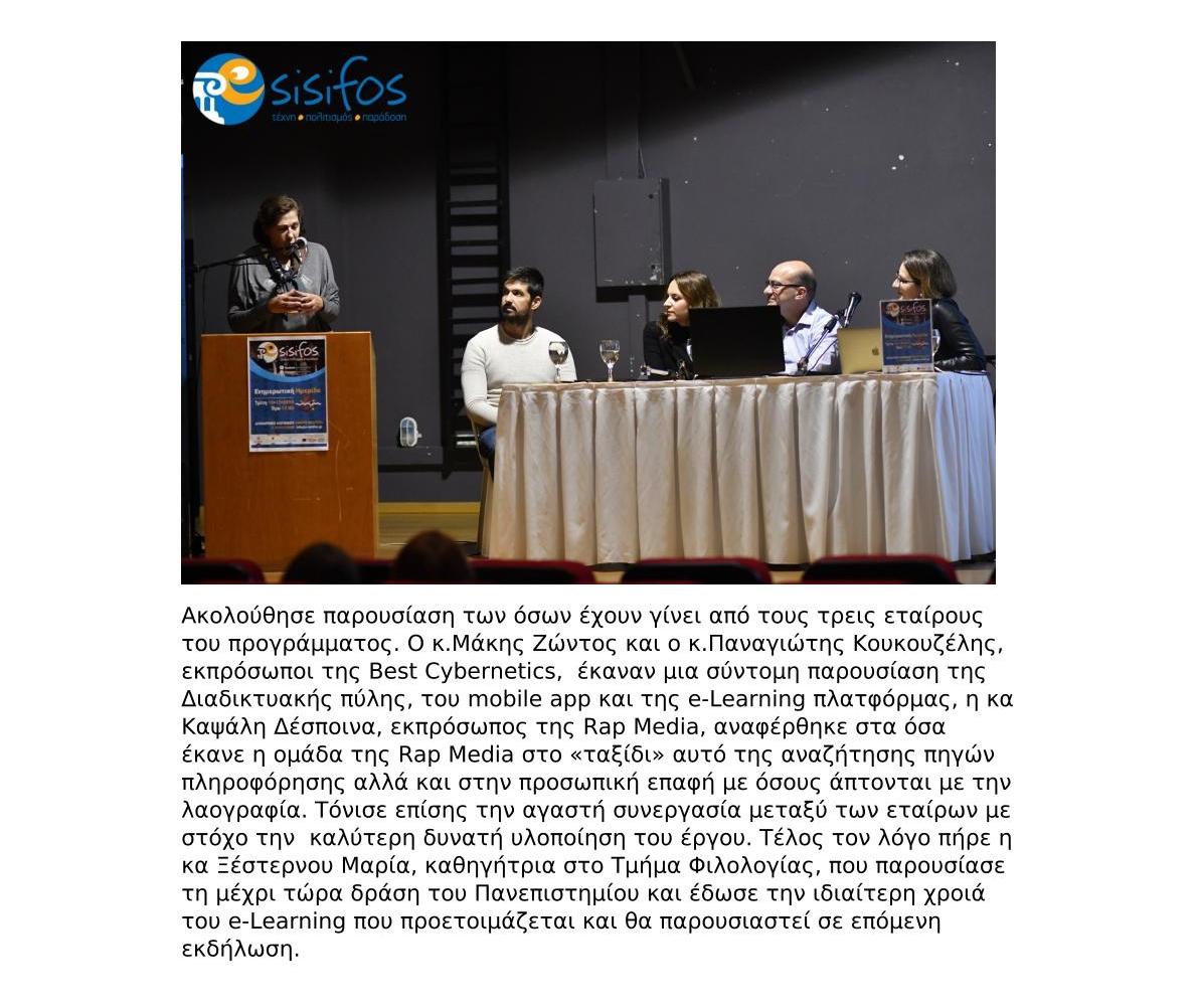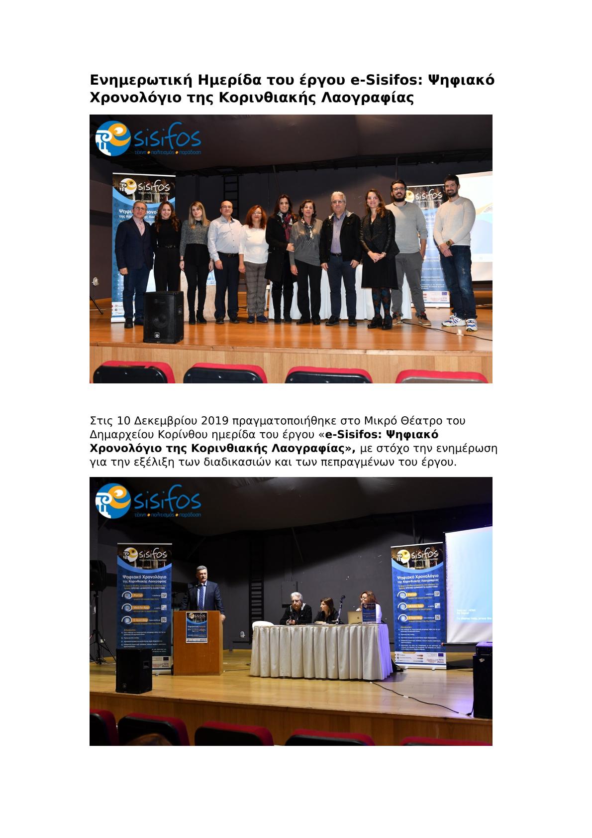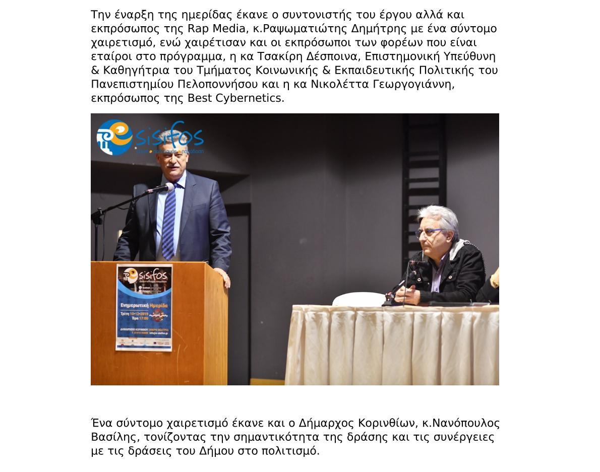 Χαιρετισμός του Δημάρχου Κορινθίων, Βασίλη Νανόπουλου, στην ενδιάμεση Ημερίδα του προγράμματος e-Sisifos: Ψηφιακό Χρονολόγιο της Κορινθιακής Λαογραφίας.