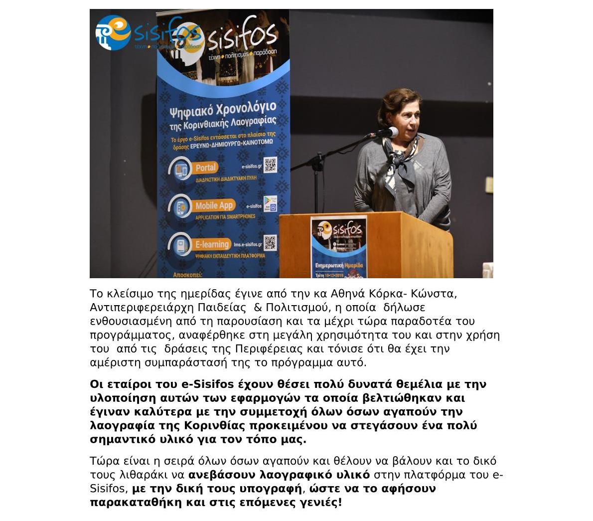 Χαιρετισμός της κα. Athena Korka – Αθηνά Κόρκα, Αντιπεριφερειάρχη Παιδείας & Πολιτισμού της Περιφέρειας Πελοποννήσου, στην ενδιάμεση ημερίδα του προγράμματος E-Sisifos!