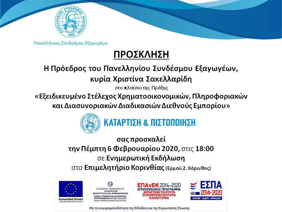 Ο Πανελλήνιος Σύνδεσμος Εξαγωγέων είναι δικαιούχος φορέας της πράξης «Εξειδικευμένο Στέλεχος Χρηματοοικονομικών, Πληροφοριακών και Διασυνοριακών Διαδικασιών Διεθνούς Εμπορίου» του Επιχειρησιακού Προγράμματος «Ανταγωνιστικότητα, Επιχειρηματικότητα και Καινοτομία» και έχει αναλάβει το συντονισμό, διαχείριση και παρακολούθηση της ορθής υλοποίησης της πράξης. Η δράση προσφέρει κατάρτιση και πιστοποίηση σε 865 ωφελούμενους που θα προέρχονται από το σύνολο των Περιφερειών της Χώρας, οι οποίοι εργάζονται σε επιχειρήσεις που αναπτύσσουν ή επιθυμούν να αναπτύξουν εξαγωγική δραστηριότητα και εντάσσονται σε όλους τους τομείς/κλάδους της οικονομίας. Σχεδόν το σύνολο της κατάρτισης θα πραγματοποιηθεί μέσω e-learning και οι ωφελούμενοι θα λάβουν εκπαιδευτικό επίδομα για τη συμμετοχή τους στη δράση.
