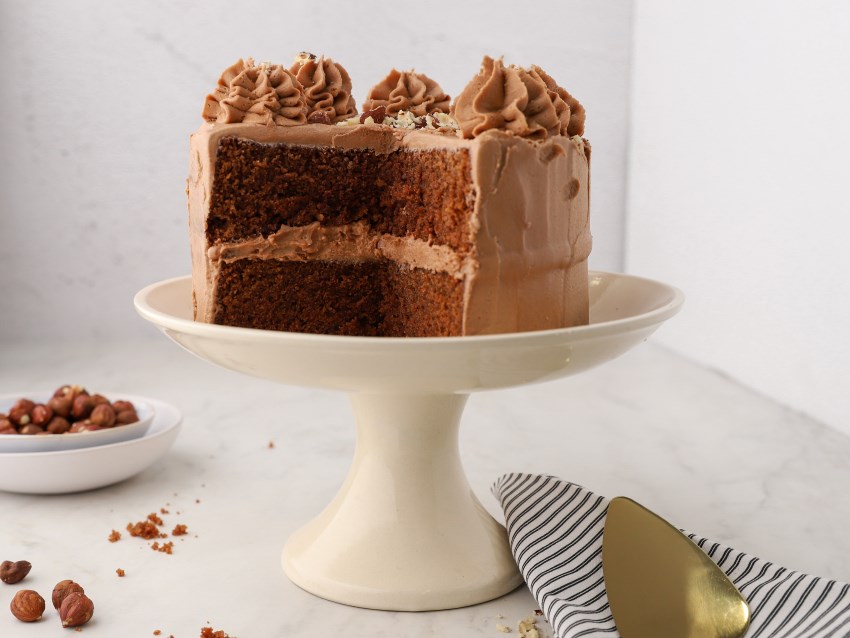 6   Μόλις είναι έτοιμο, μεταφέρουμε το μείγμα σε 2 στρογγυλές φόρμες για κέικ διαμέτρου 20εκ., στις οποίες έχουμε στρώσει λαδόκολλα και ψήνουμε σε προθερμασμένο φούρνο 175°C στον αέρα για 50-60 λεπτά.