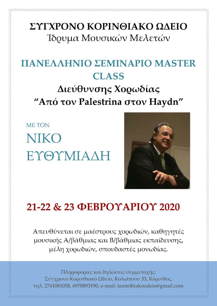 Από την Παρασκευή 21 έως και την Κυριακή 23 Φεβρουαρίου θα πραγματοποιηθεί στην Κόρινθο ένα σημαντικό και ενδιαφέρον από παιδαγωγικής και μουσικής άποψης Σεμινάριο Διεύθυνσης Χορωδίας, που διοργανώνει το Σύγχρονο Κορινθιακό Ωδείο, στο οποίο θα διδάξει ένας εκ των κορυφαίων διευθυντών Χορωδίας, ο Νίκος Ευθυμιάδης (Master of Arts στη Διεύθυνση). Το τριήμερο σεμινάριο (21 έως και 23 Φεβρουαρίου 2020) απευθύνεται σε Διευθυντές Χορωδιών (μικτών, ανδρικών, γυναικείων, παιδικών, νεανικών, ωδείων, σχολείων κ.λπ.), σε καθηγητές μουσικής Α/θμιας και Β/θμιας εκπαίδευσης που διευθύνουν χορωδία, καθώς και σε σπουδαστές μουσικής, εκκολαπτόμενους διευθυντές χορωδίας και σε ερασιτέχνες διευθυντές χορωδίας, χορωδούς κλπ.