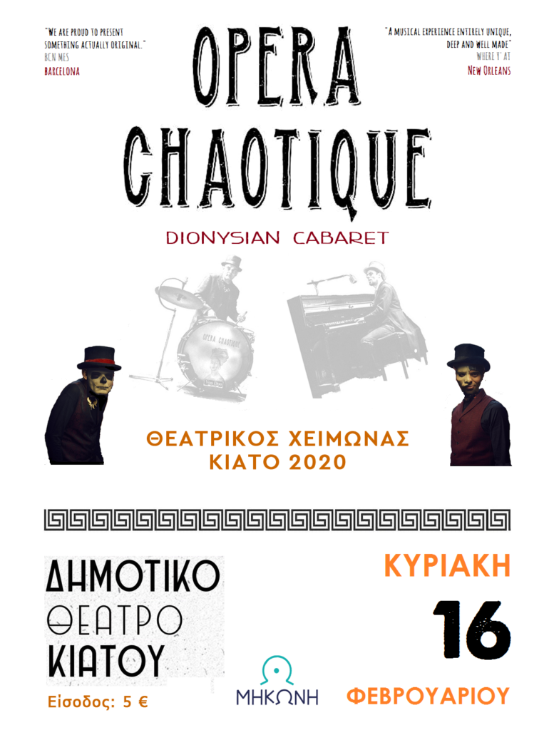 Στα πλαίσια του Θεατρικού Χειμώνα Κιάτο ’20 του ΝΠΔΔ ΜΗΚΩΝΗ Δ. Σικυωνίων οι OPERA CHAOTIQUE παρουσιάζουν την Κυριακή 16 Φεβρουαρίου στο Δημοτικό θέατρο Κιάτου το νέο τους show