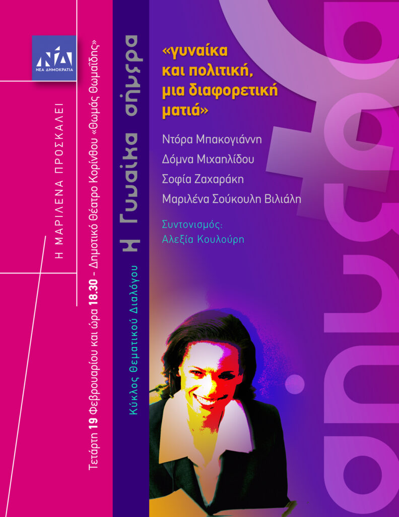 Η βουλευτής Κορινθίας ΝΔ κα Μαριλένα Σούκουλη-Βιλιάλη σας προσκαλεί  στην εκδήλωση με θέμα «Γυναίκα και πολιτική, μια διαφορετική ματιά» στα πλαίσια του κύκλου θεματικού διαλόγου  Η Γυναίκα Σήμερα .