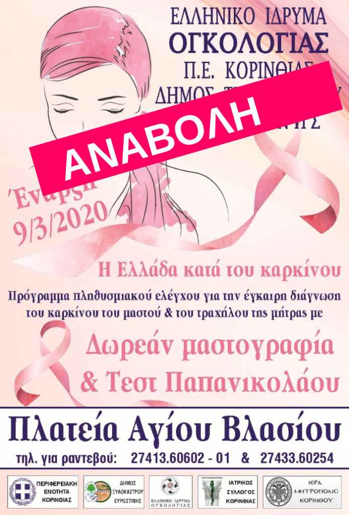 Η Περιφερειακή Ενότητα Κορινθίας, ο Δήμος Ξυλοκάστρου- Ευρωστίνης και ο Ελληνικό Ίδρυμα Ογκολογίας, έπειτα από κοινή απόφαση ενημερώνει τον γυναικείο πληθυσμό του Δήμου μας ότι αναστέλλεται η λειτουργία της Ογκολογικής Μονάδας στο Ξυλόκαστρο για κάποιο διάστημα για την διασφάλιση της υγείας των πολιτών από τον Κορονοϊό. Η Μονάδα θα επανέλθει στο Ξυλόκαστρο μετά το πέρας της πανδημίας.