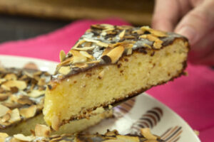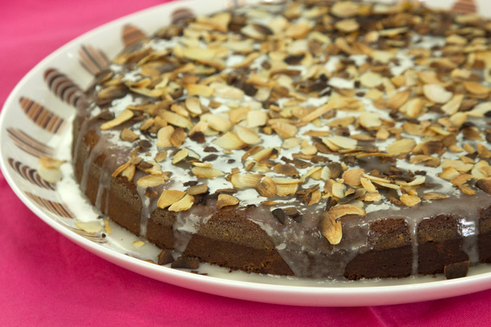 Όταν το κέικ έχει κρυώσει αρκετά, απλώστε πάνω του το γλάσο και στη συνέχεια πασπαλίστε τα αμύγδαλα.