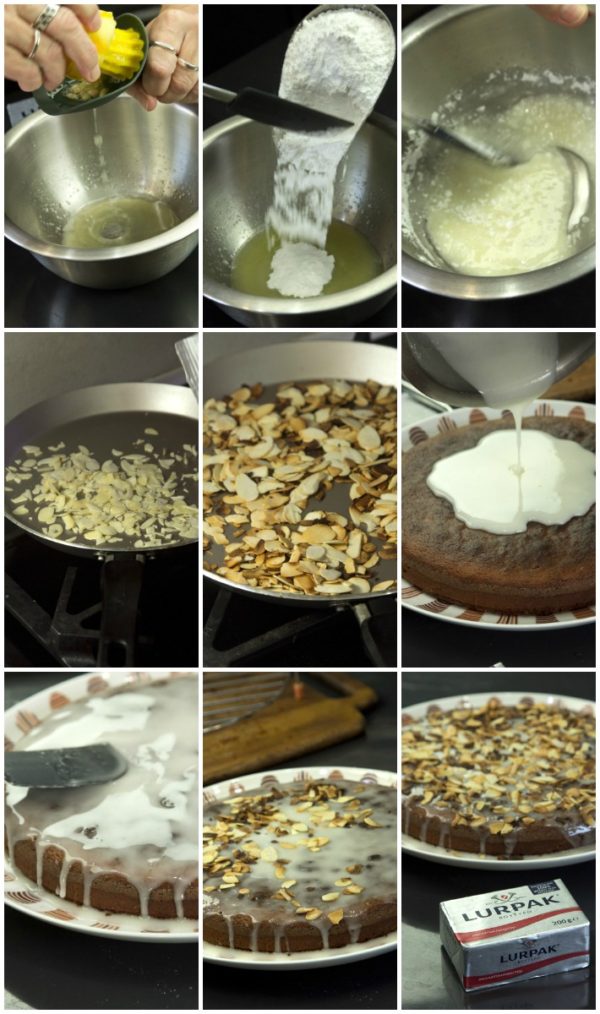 Πρέπει να αφήσετε το κέικ να κρυώσει περί τη μισή ώρα πριν το γλασάρετε, Σ΄ αυτό το διάστημα, μπορείτε να καβουρντίσετε τα κομμένα αμύγδαλα με ένα τηγανάκι στην εστία σε μεσαία ένταση ανακατεύοντας συνέχεια, αλλά θέλει πολύ προσοχή και να είστε συνέχεια από πάνω, καθώς απ’ τη στιγμή που παίρνουν χρώμα, είναι ζήτημα 15 δευτερολέπτων να αρχίσουν να καίγονται.