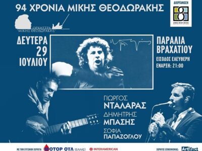 Συναυλία της Λαϊκής Ορχήστρας “Μίκης Θεοδωράκης” με τους Γιώργο Νταλάρα, Δημήτρη Μπάση και Σοφία Παπάζογλου στις 29 Ιουλίου 2019 στο Βραχάτι Κορινθίας. Έναρξη: 21:00, Είσοδος Ελεύθερη