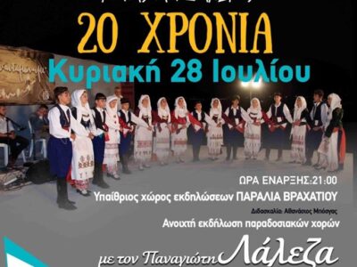 “ΠΑΝΤΑ ΝΑ ΑΝΤΑΜΩΝΟΥΜΕ” Η καθιερωμένη ανοιχτή εκδήλωση παραδοσιακών χορών του συλλόγου μας θα πραγματοποιηθεί 28 Ιουλίου 2019 και ώρα 21:00 στην παραλία Βραχατίου. ...