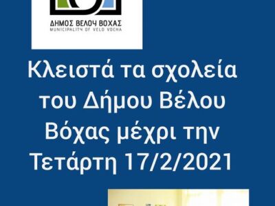 Ξυλόκαστρο: Όλες οι σχολικές μονάδες του Δήμου θα παραμείνουν ΚΛΕΙΣΤΕΣ την Δευτέρα 15 και την Τρίτη 16 Φεβρουαρίου.
