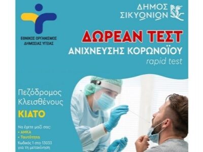 Ο Εθνικός Οργανισμός Δημόσιας Υγείας (ΕΟΔΥ) σε συνεργασία με τον Ερυθρό Σταυρό Κορίνθου και το Δήμο Σικυωνίων θα διεξάγουν δωρεάν ελέγχους ταχείας ανίχνευσης ...